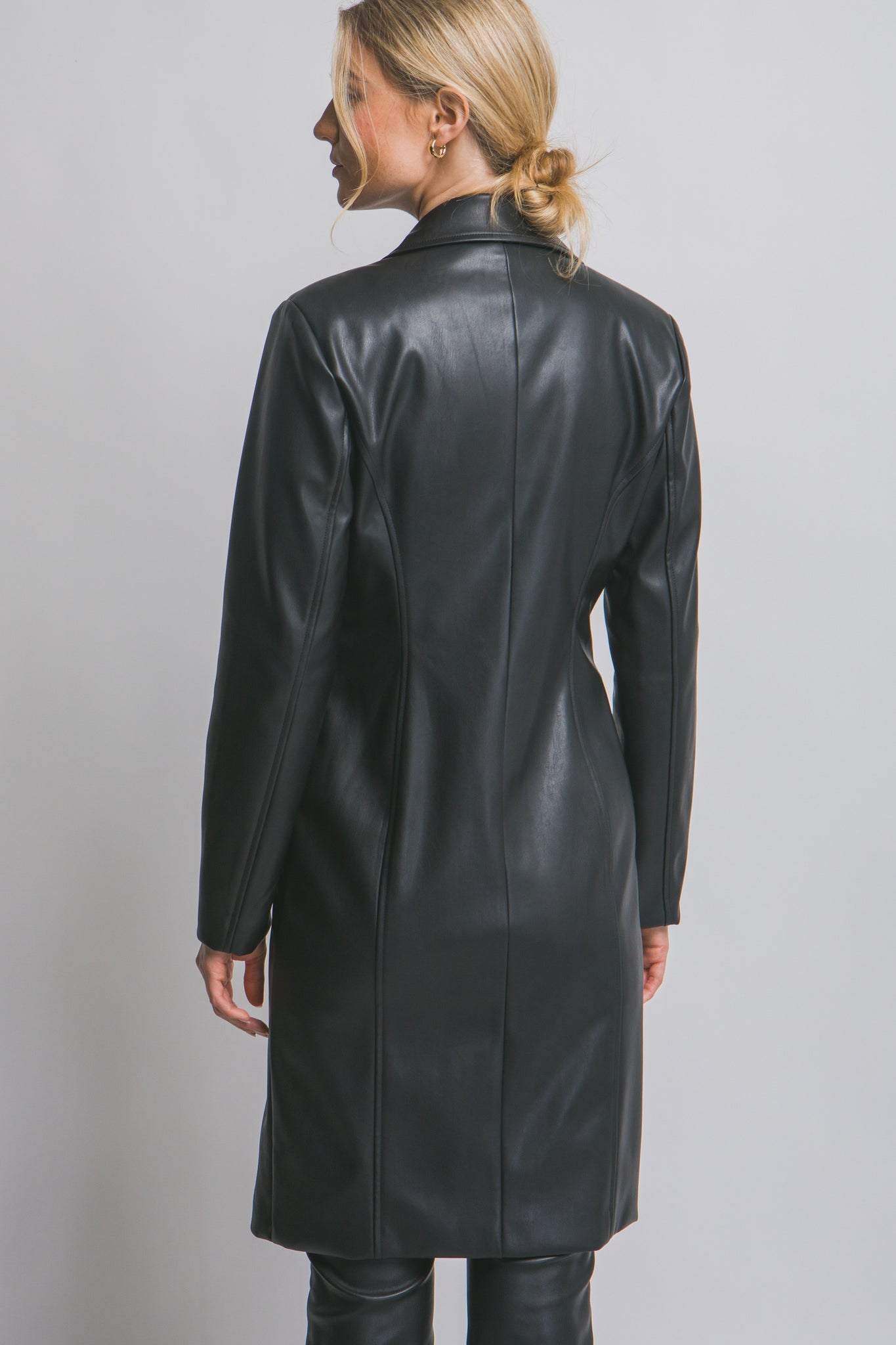 This is our Black Faux Leather Trench Coat, this coat features a bold, eye-catching silhouette that exudes confidence and drama. It’s made from smooth or slightly textured leather with a glossy or matte finish, depending on the style. The button up style completes the elegance of this garment.