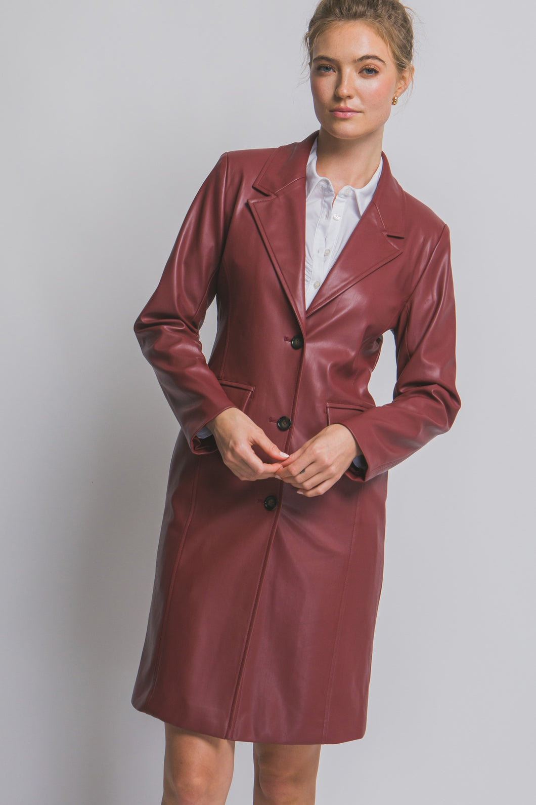 This is our Burgundy Faux Leather Trench Coat, this coat features a bold, eye-catching silhouette that exudes confidence and drama. It’s made from smooth or slightly textured leather with a glossy or matte finish, depending on the style. The button up style completes the elegance of this garment.