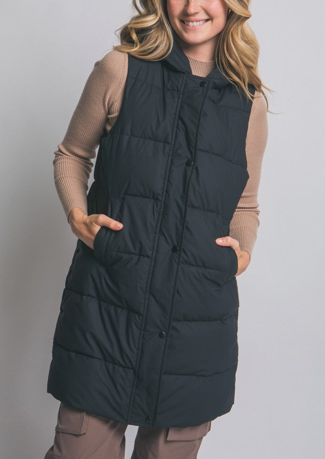 A black, long quilted puffer vest with a hood. It has a matte finish, snap button closure, and side pockets for a cozy, casual look. The length hits mid-thigh, giving it a slightly oversized, modern silhouette, perfect for layering over sweaters or knits in cooler weather. The black tone makes it versatile and chic, ideal for fall or early winter.